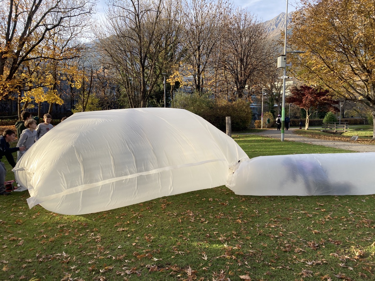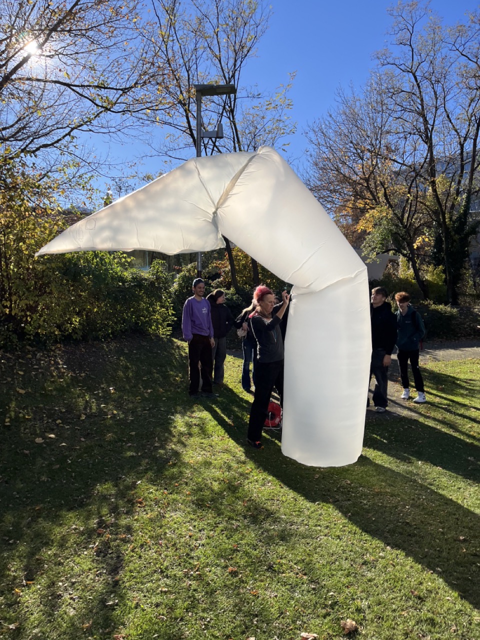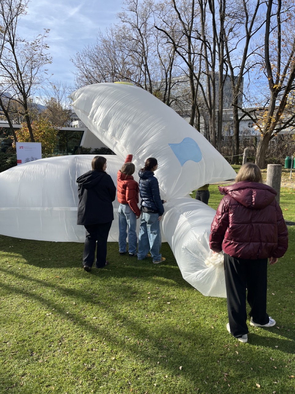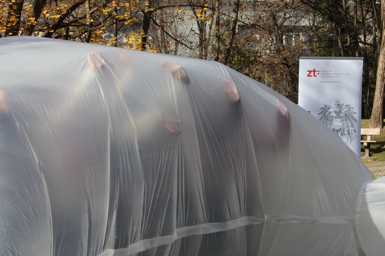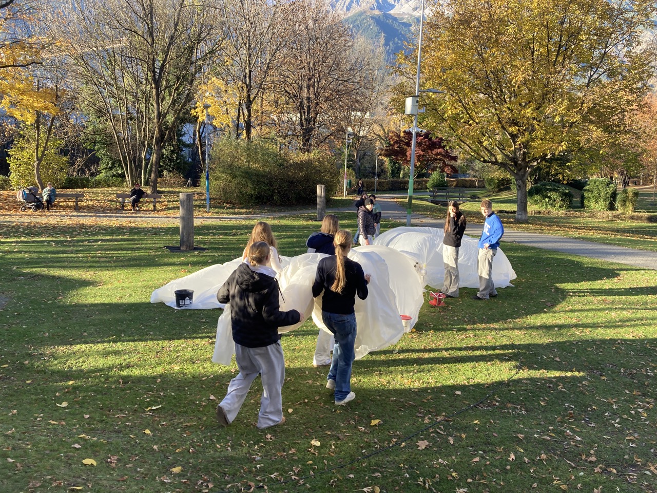 In zahlreichen Workshops vom 6.11. bis 14.11. mit hands on – Bauaktionen und kreativen Raumexperimenten konnten Schulgruppen aus ganz Tirol praktische Erfahrungen zu inflateable architecture, entsprechende Materialien und Bauweisen dazu erleben. Von Workshop bis Workshop wurde alles Wissen zu Pneu, Luftdruck und Dimension gesammelt und die Rauminstallation immer größer. Schüler:innen der HBLA Innsbruck haben das Projekt „wir brauchen Raum“ mit einer über mehrere Tage gewachsenen aufblasbaren Membranarchitektur abgeschlossen.