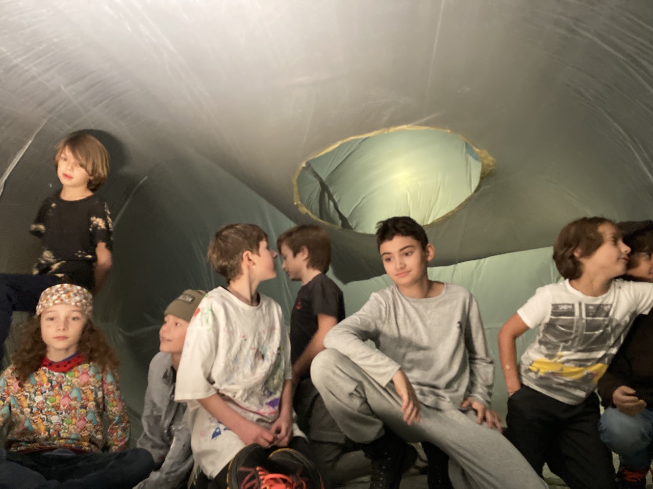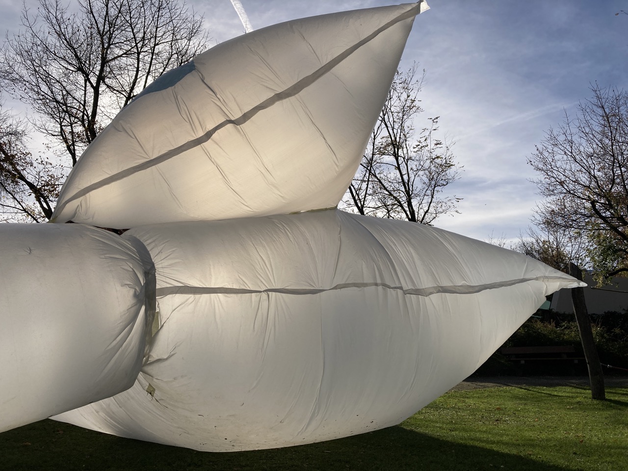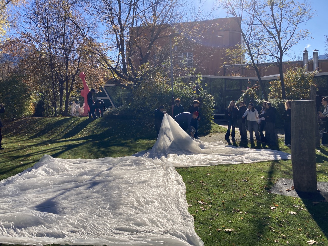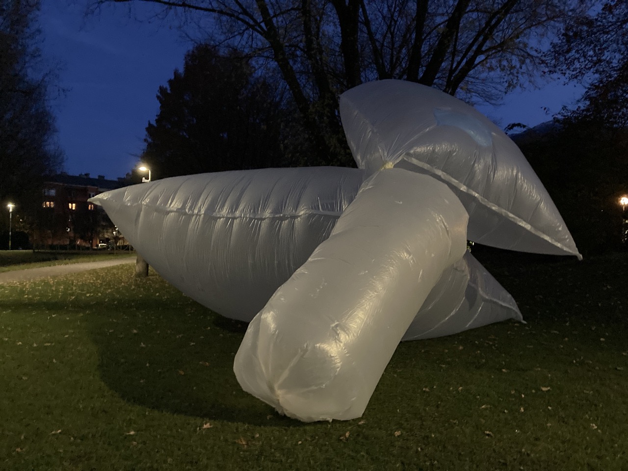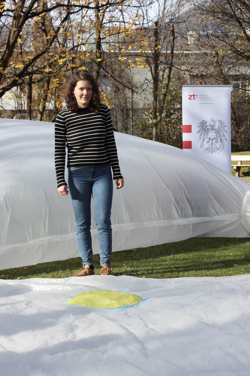 In zahlreichen Workshops vom 6.11. bis 14.11. mit hands on – Bauaktionen und kreativen Raumexperimenten konnten Schulgruppen aus ganz Tirol praktische Erfahrungen zu inflateable architecture, entsprechende Materialien und Bauweisen dazu erleben. Von Workshop bis Workshop wurde alles Wissen zu Pneu, Luftdruck und Dimension gesammelt und die Rauminstallation immer größer. Schüler:innen der HBLA Innsbruck haben das Projekt „wir brauchen Raum“ mit einer über mehrere Tage gewachsenen aufblasbaren Membranarchitektur abgeschlossen.