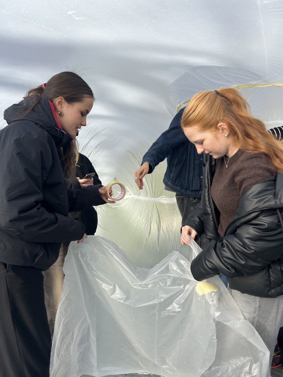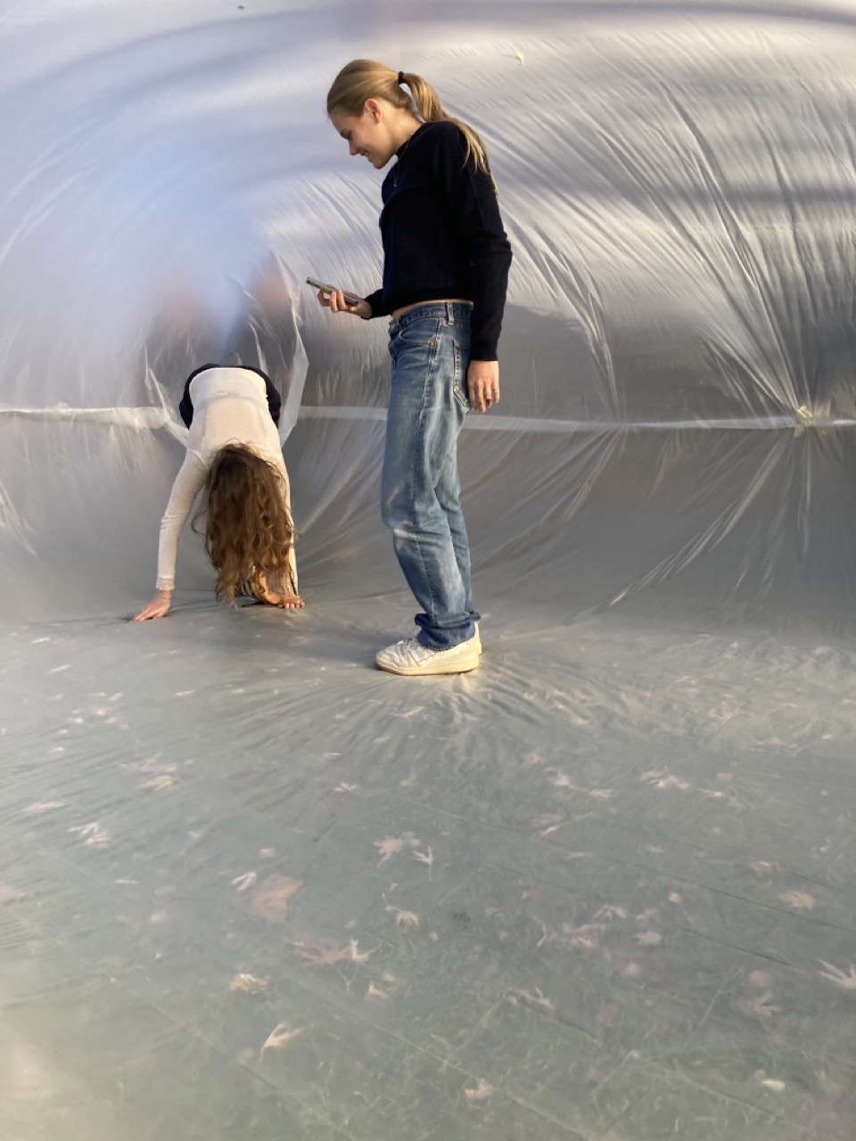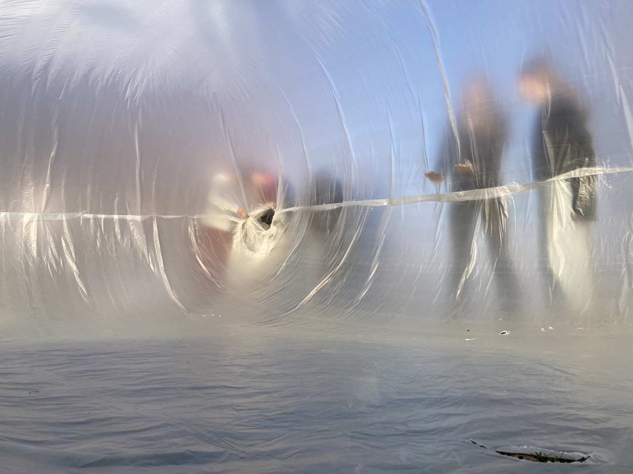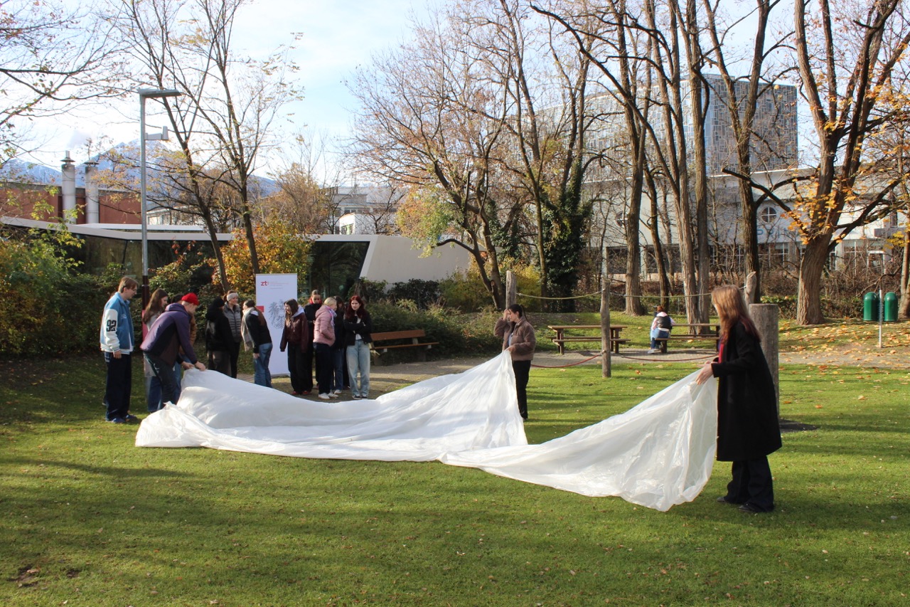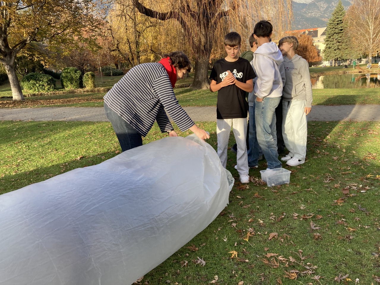 In zahlreichen Workshops vom 6.11. bis 14.11. mit hands on – Bauaktionen und kreativen Raumexperimenten konnten Schulgruppen aus ganz Tirol praktische Erfahrungen zu inflateable architecture, entsprechende Materialien und Bauweisen dazu erleben. Von Workshop bis Workshop wurde alles Wissen zu Pneu, Luftdruck und Dimension gesammelt und die Rauminstallation immer größer. Schüler:innen der HBLA Innsbruck haben das Projekt „wir brauchen Raum“ mit einer über mehrere Tage gewachsenen aufblasbaren Membranarchitektur abgeschlossen.