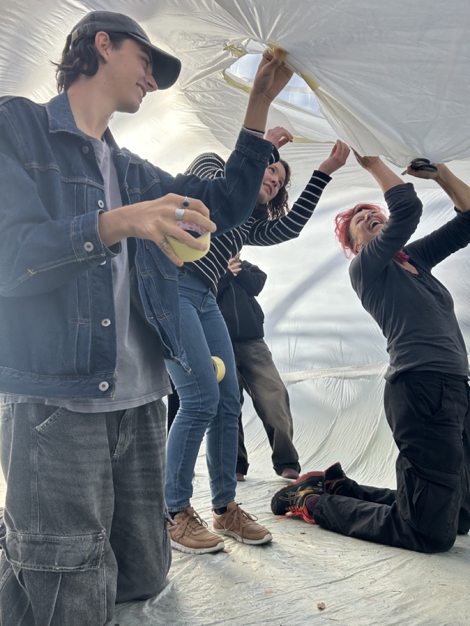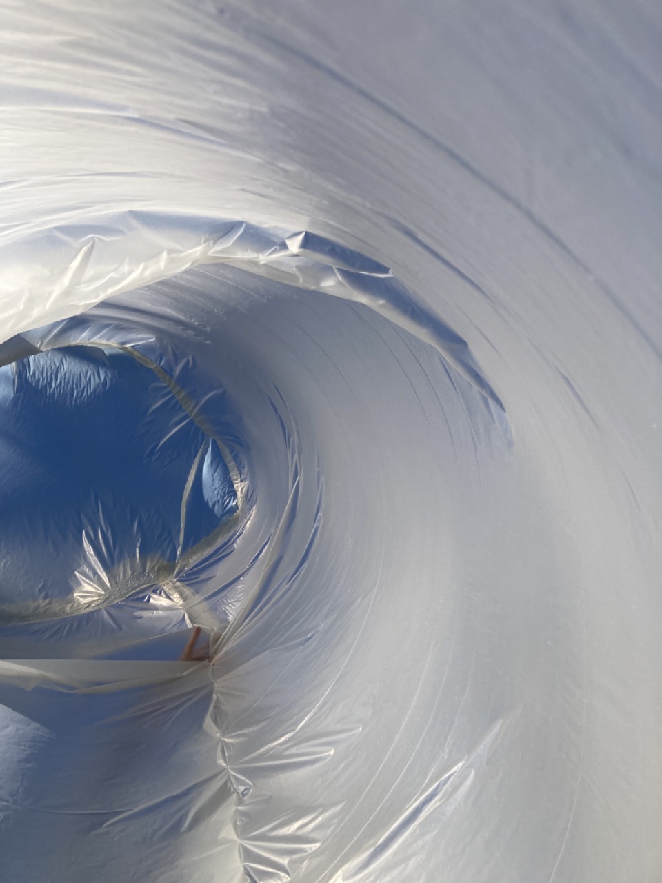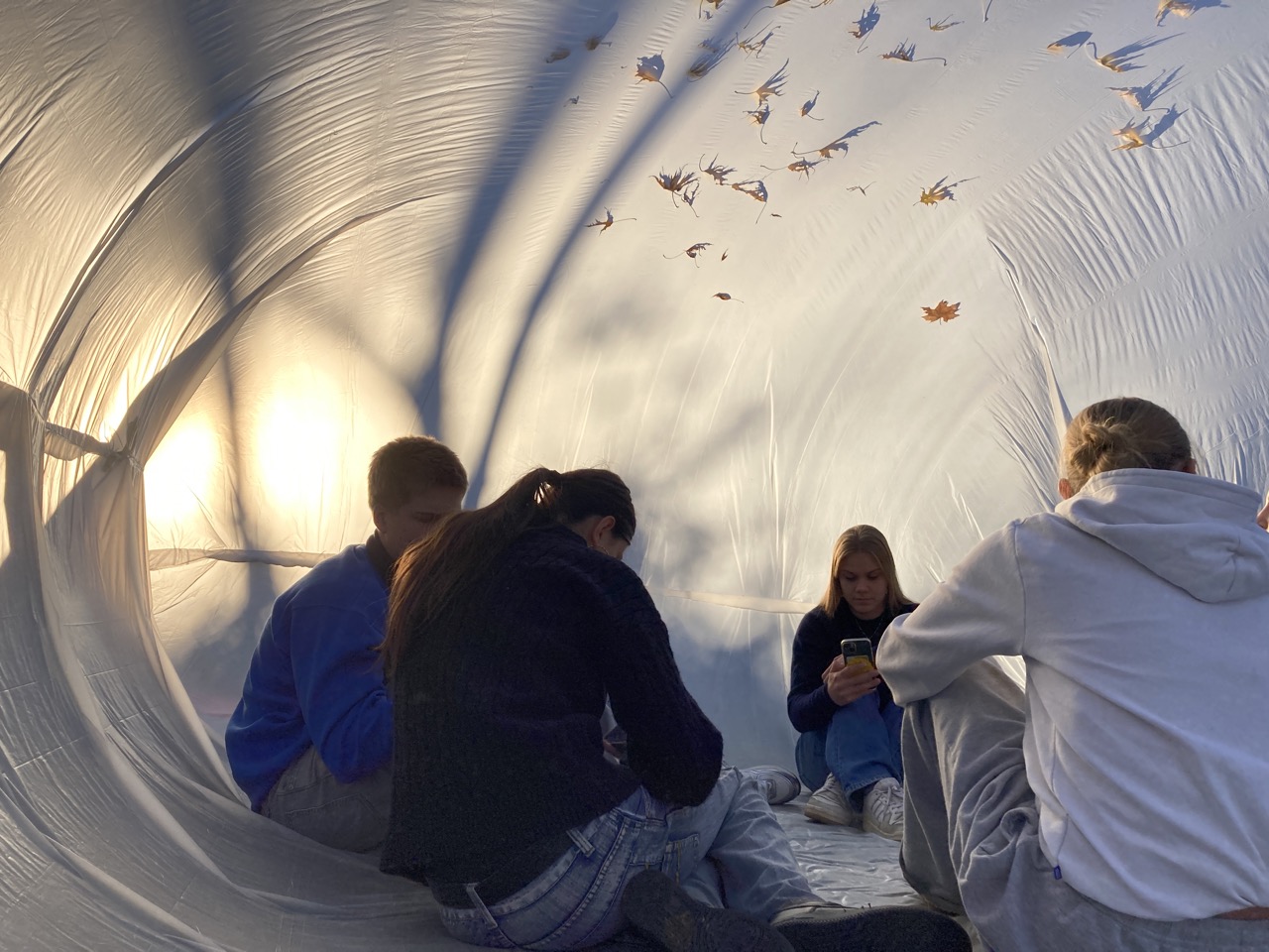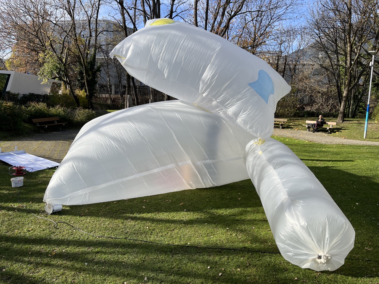 In zahlreichen Workshops vom 6.11. bis 14.11. mit hands on – Bauaktionen und kreativen Raumexperimenten konnten Schulgruppen aus ganz Tirol praktische Erfahrungen zu inflateable architecture, entsprechende Materialien und Bauweisen dazu erleben. Von Workshop bis Workshop wurde alles Wissen zu Pneu, Luftdruck und Dimension gesammelt und die Rauminstallation immer größer. Schüler:innen der HBLA Innsbruck haben das Projekt „wir brauchen Raum“ mit einer über mehrere Tage gewachsenen aufblasbaren Membranarchitektur abgeschlossen.