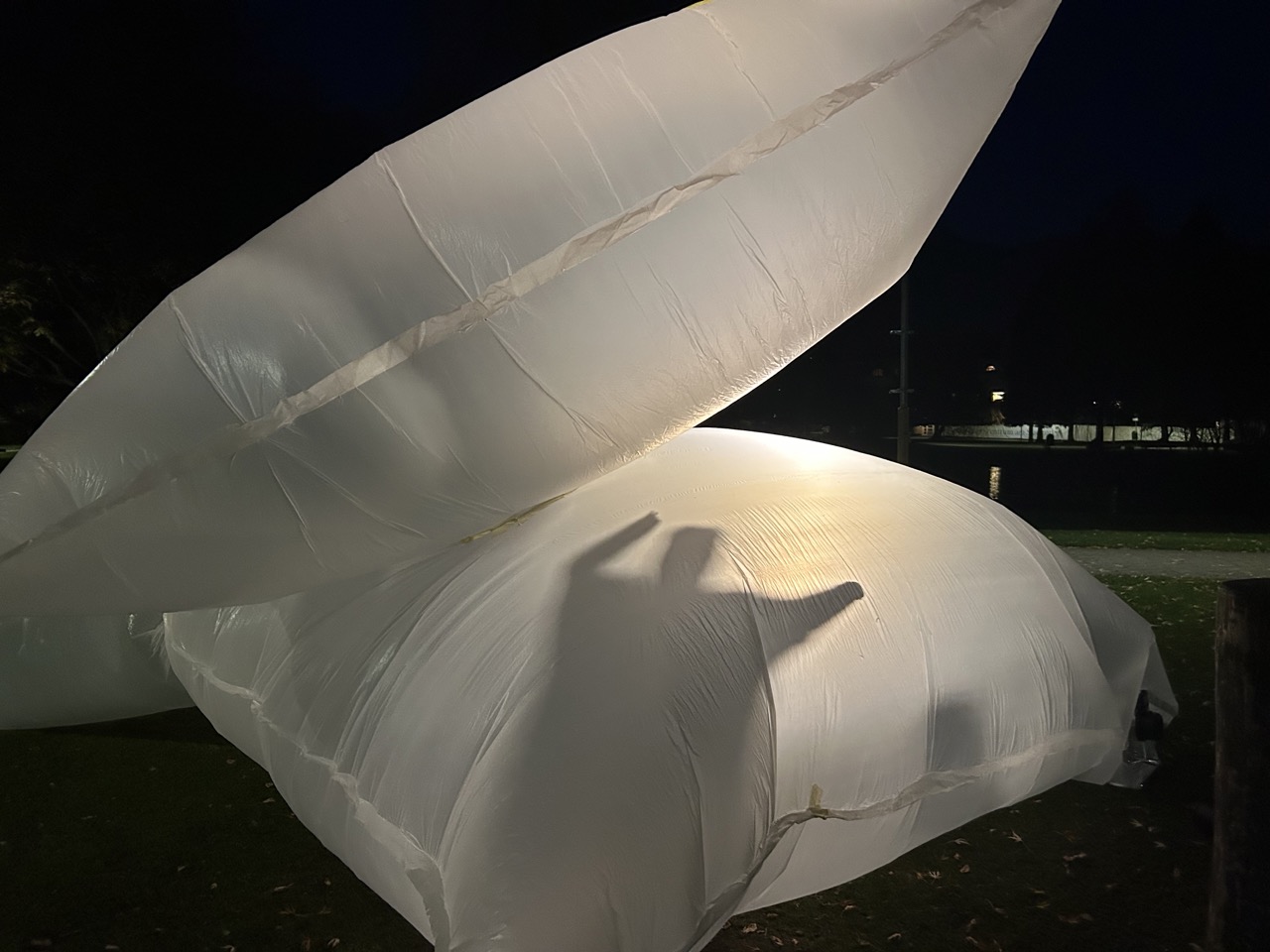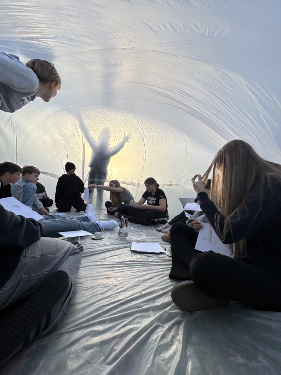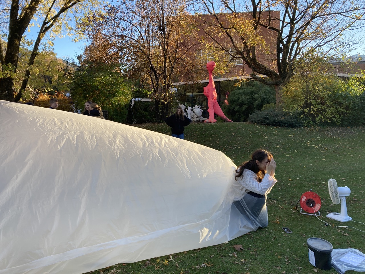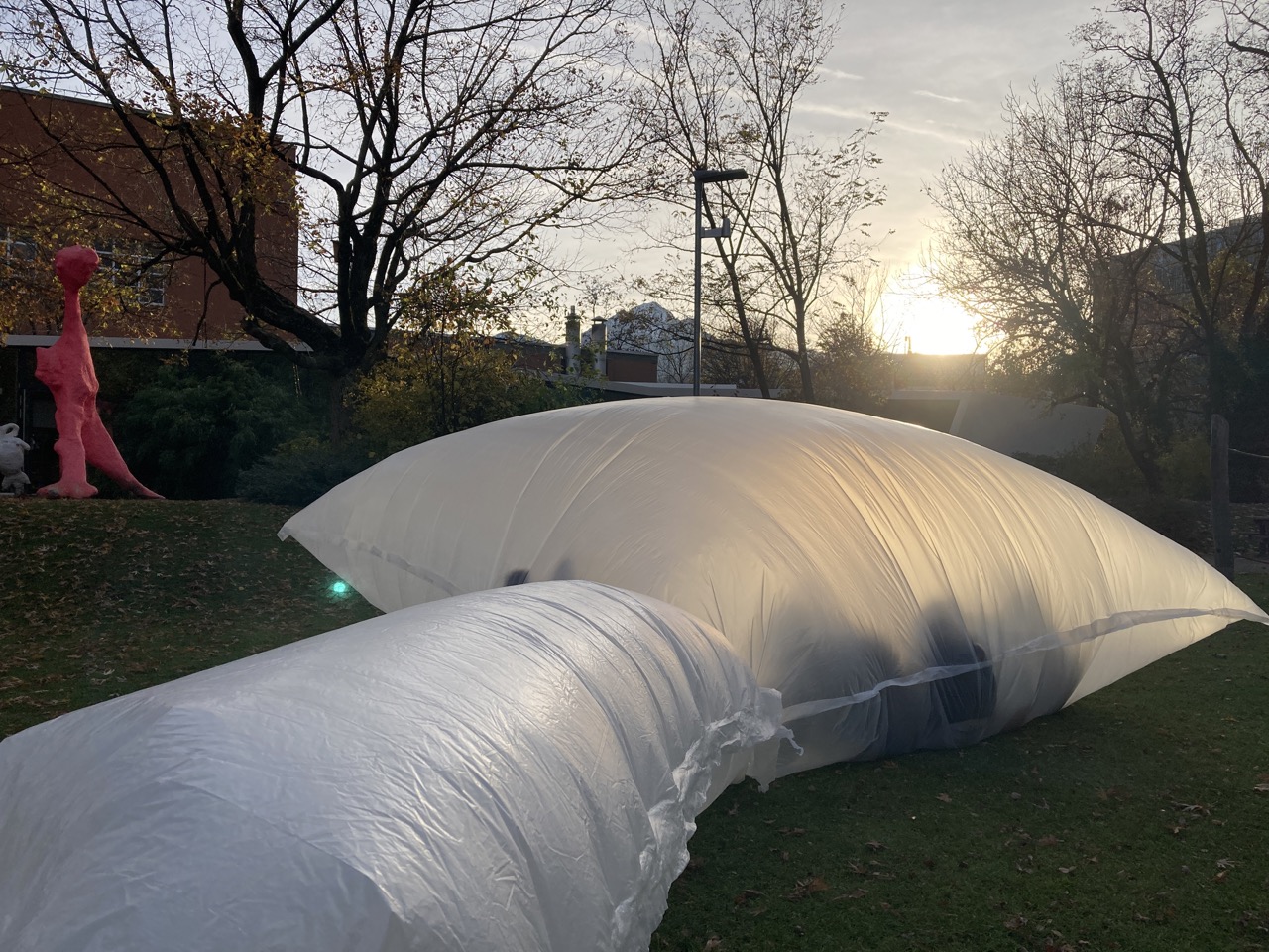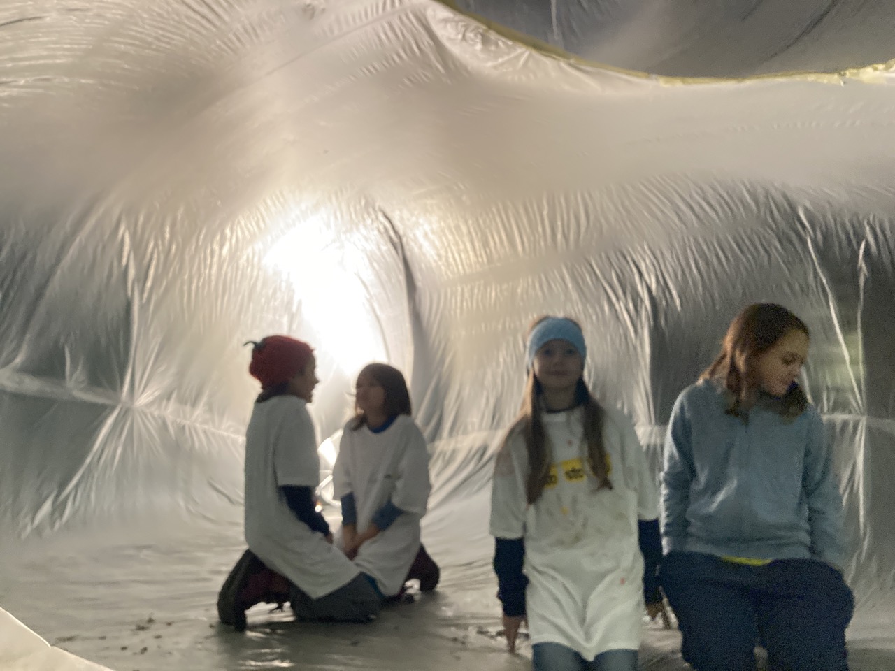 In zahlreichen Workshops vom 6.11. bis 14.11. mit hands on – Bauaktionen und kreativen Raumexperimenten konnten Schulgruppen aus ganz Tirol praktische Erfahrungen zu inflateable architecture, entsprechende Materialien und Bauweisen dazu erleben. Von Workshop bis Workshop wurde alles Wissen zu Pneu, Luftdruck und Dimension gesammelt und die Rauminstallation immer größer. Schüler:innen der HBLA Innsbruck haben das Projekt „wir brauchen Raum“ mit einer über mehrere Tage gewachsenen aufblasbaren Membranarchitektur abgeschlossen.