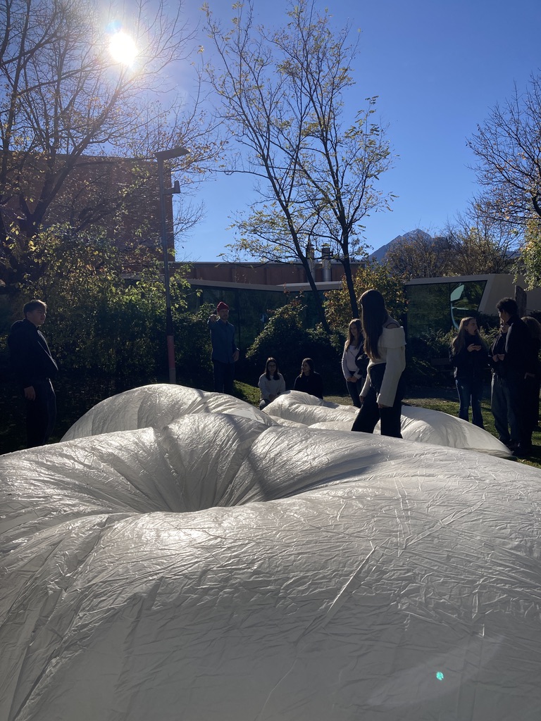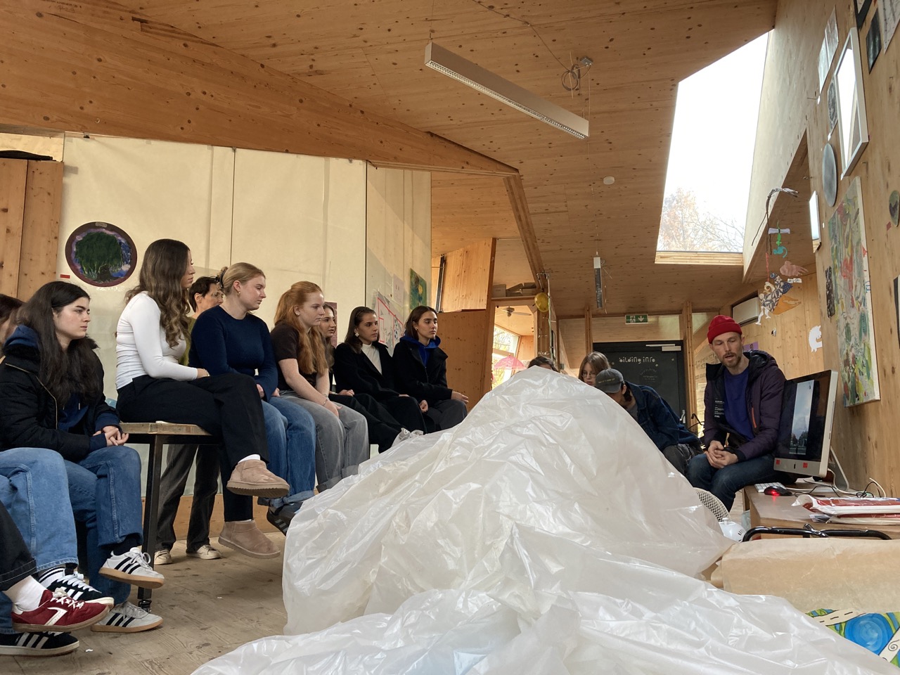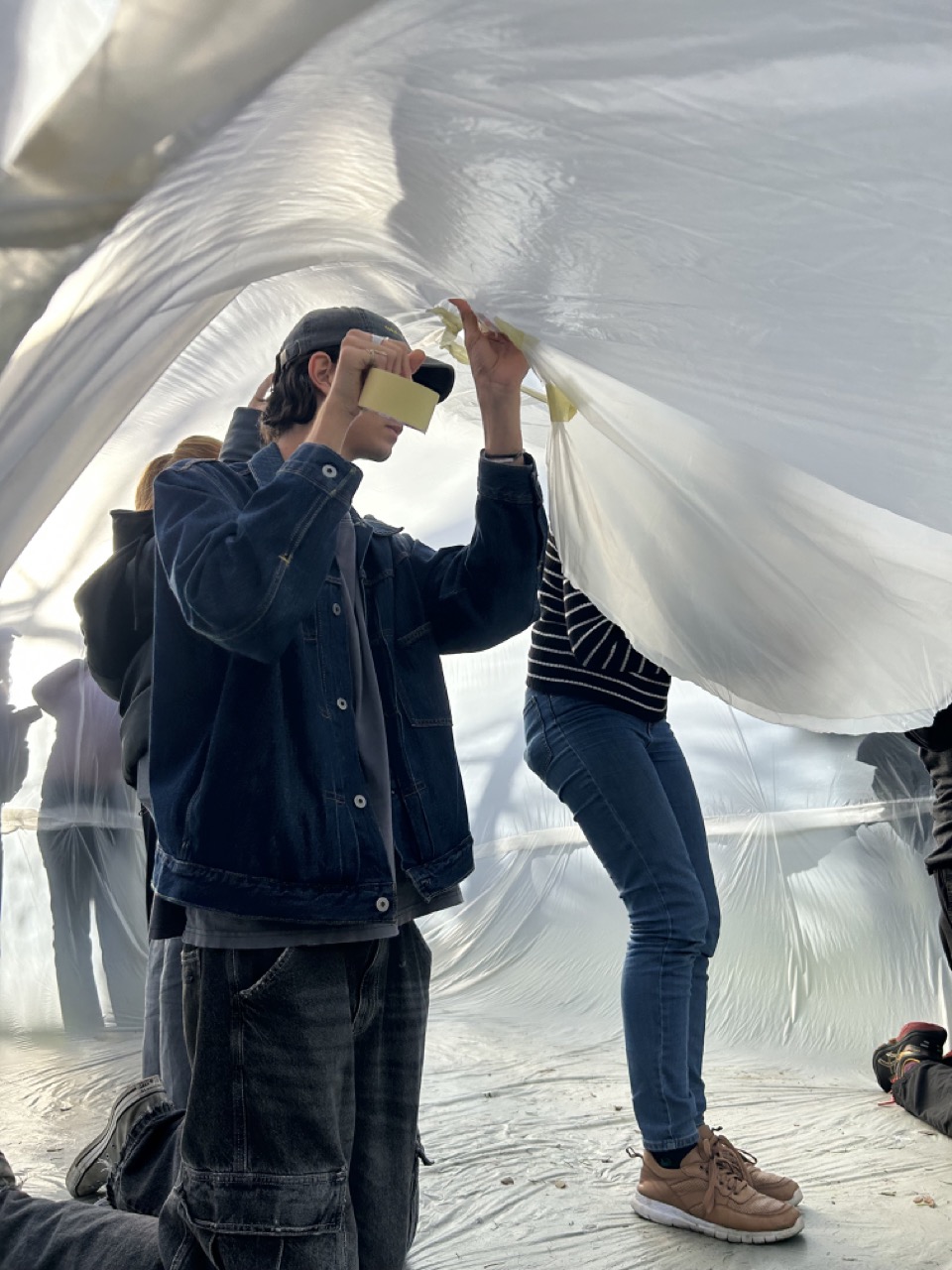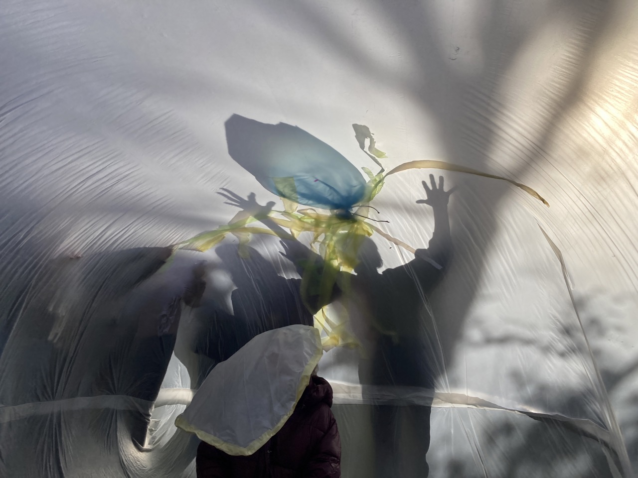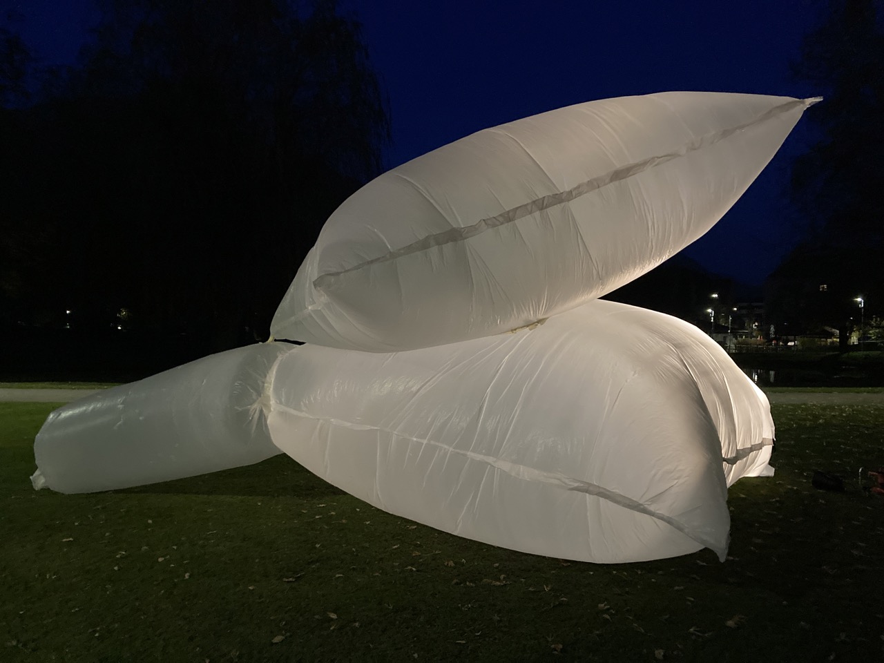 In zahlreichen Workshops vom 6.11. bis 14.11. mit hands on – Bauaktionen und kreativen Raumexperimenten konnten Schulgruppen aus ganz Tirol praktische Erfahrungen zu inflateable architecture, entsprechende Materialien und Bauweisen dazu erleben. Von Workshop bis Workshop wurde alles Wissen zu Pneu, Luftdruck und Dimension gesammelt und die Rauminstallation immer größer. Schüler:innen der HBLA Innsbruck haben das Projekt „wir brauchen Raum“ mit einer über mehrere Tage gewachsenen aufblasbaren Membranarchitektur abgeschlossen.