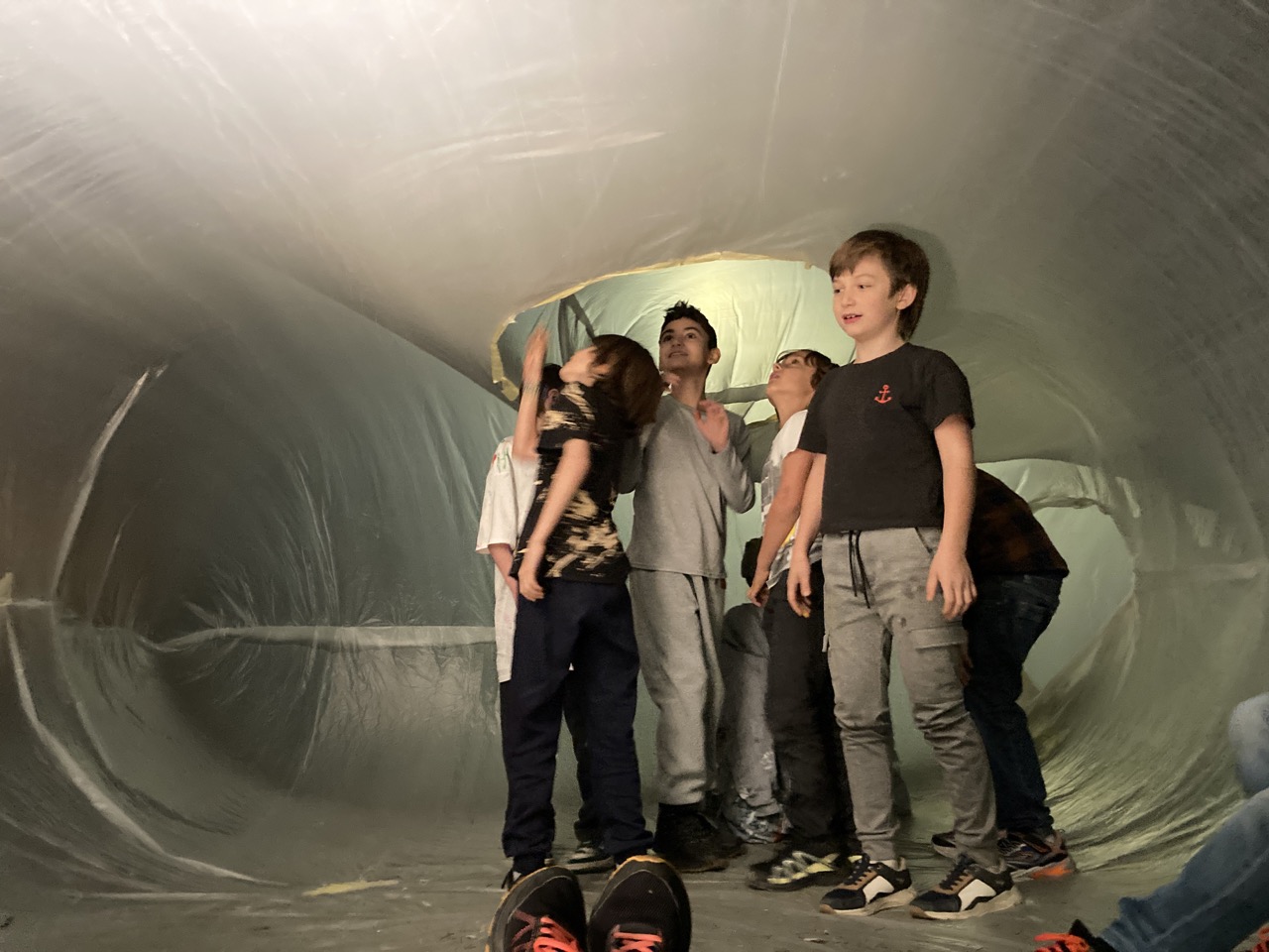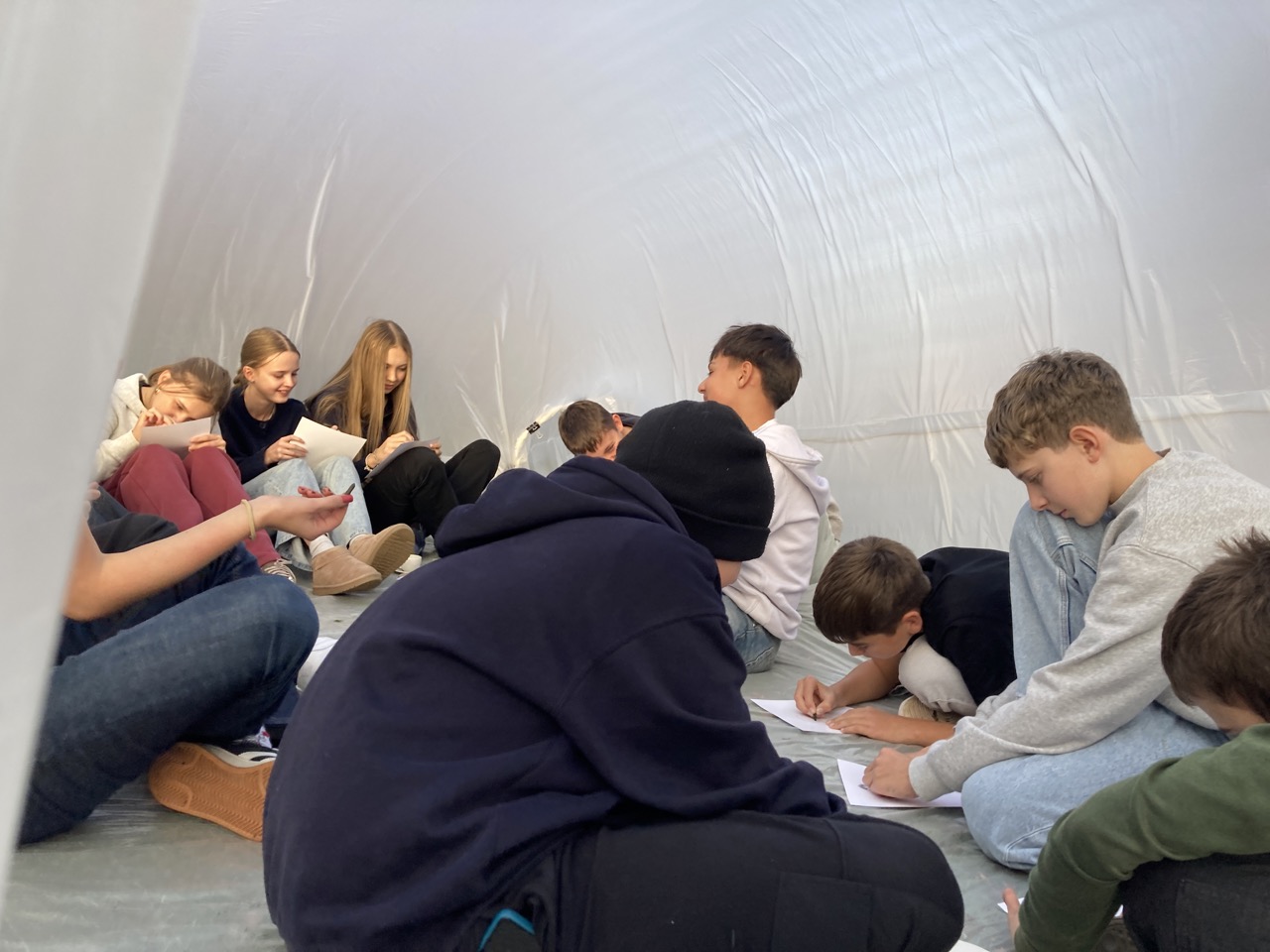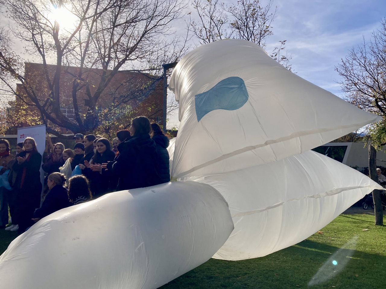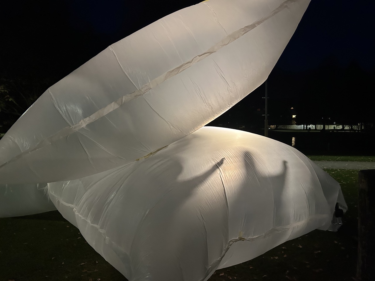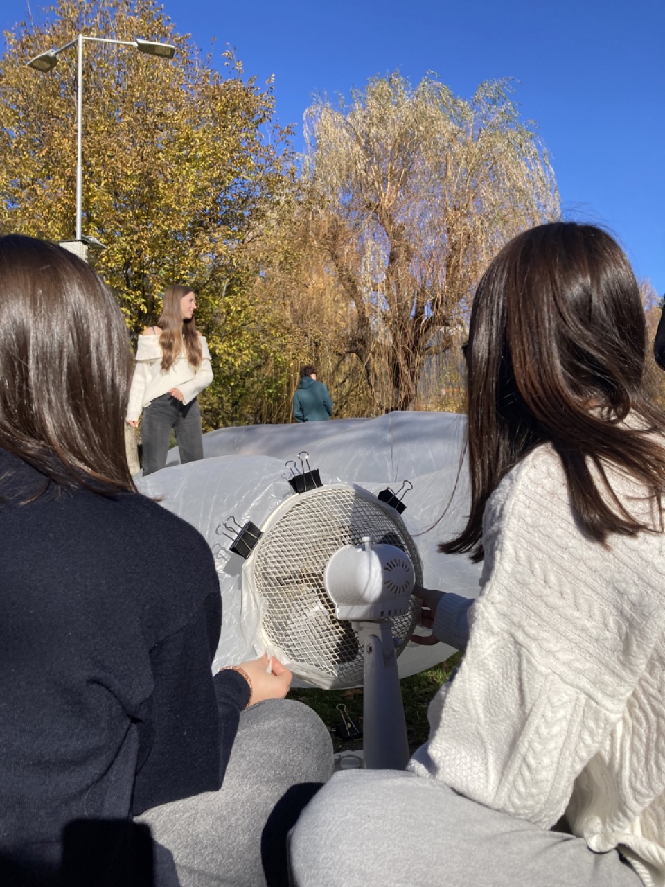 In zahlreichen Workshops vom 6.11. bis 14.11. mit hands on – Bauaktionen und kreativen Raumexperimenten konnten Schulgruppen aus ganz Tirol praktische Erfahrungen zu inflateable architecture, entsprechende Materialien und Bauweisen dazu erleben. Von Workshop bis Workshop wurde alles Wissen zu Pneu, Luftdruck und Dimension gesammelt und die Rauminstallation immer größer. Schüler:innen der HBLA Innsbruck haben das Projekt „wir brauchen Raum“ mit einer über mehrere Tage gewachsenen aufblasbaren Membranarchitektur abgeschlossen.