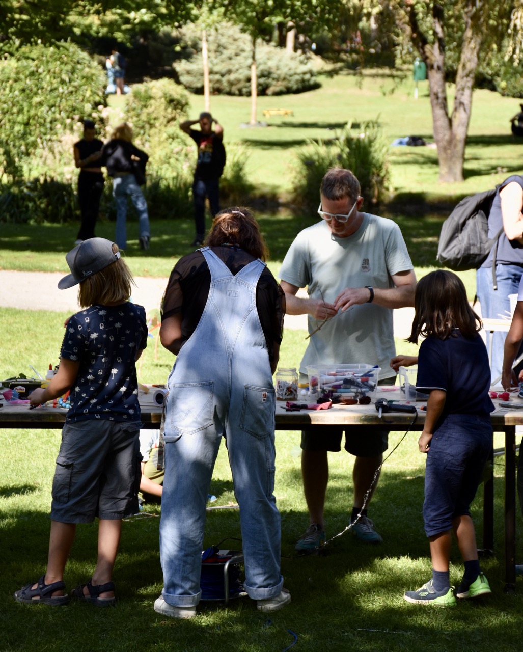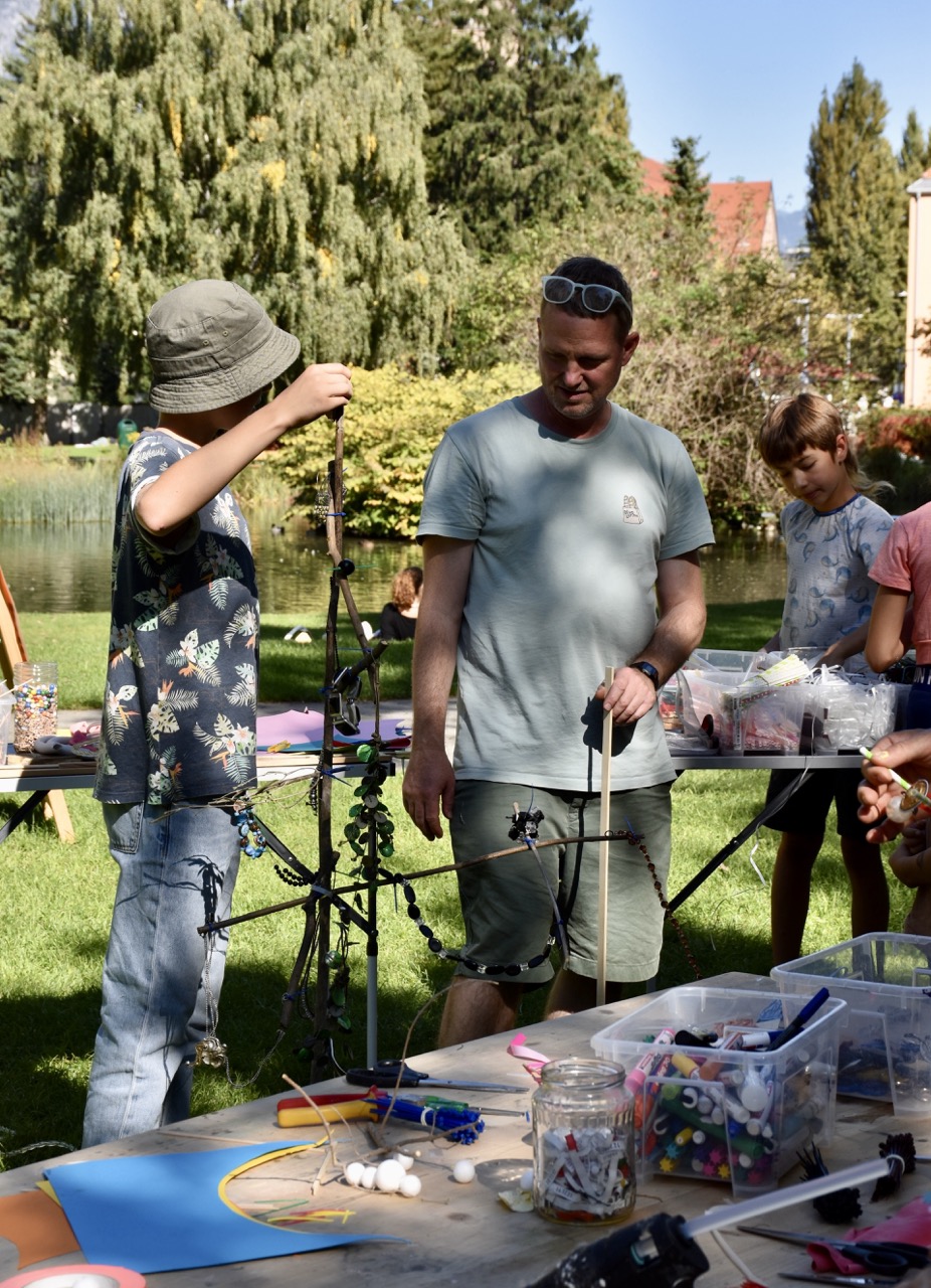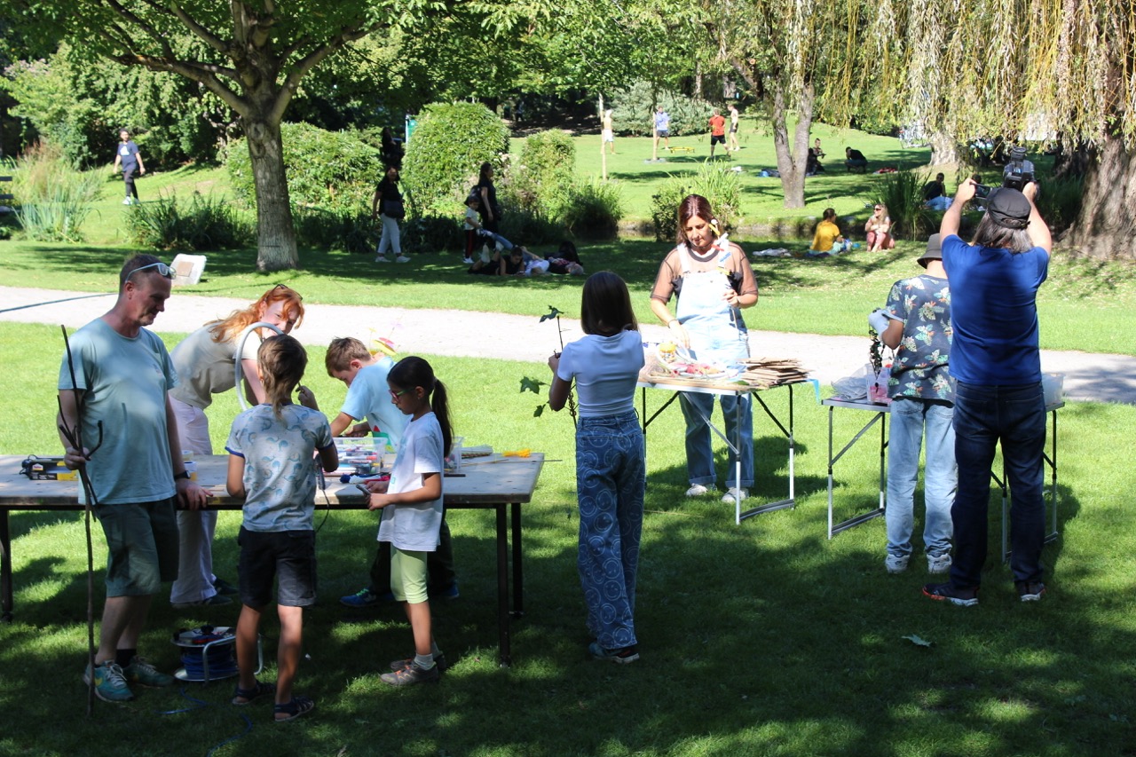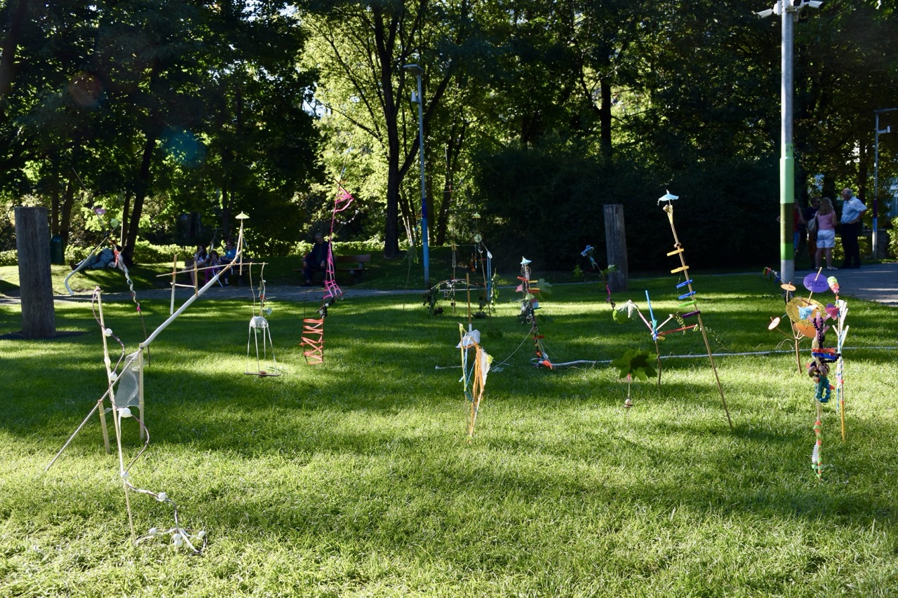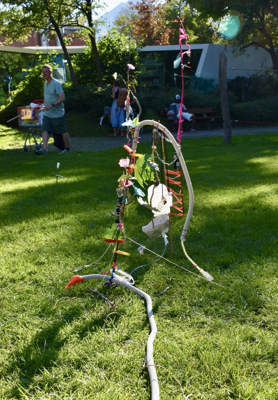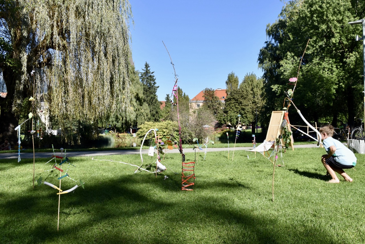 Das bidling schlägt Wurzeln. Die Baumaterialen aus dem bilding werden von den Workshopteilnehmer*innen mit den Naturmaterialien aus dem Rapoldipark zu neuen Hybriden verbunden und in den Park gepflanzt, um als kollektive Veränderungsprozesse aus dem bilding hinaus in die Stadt zu wachsen.