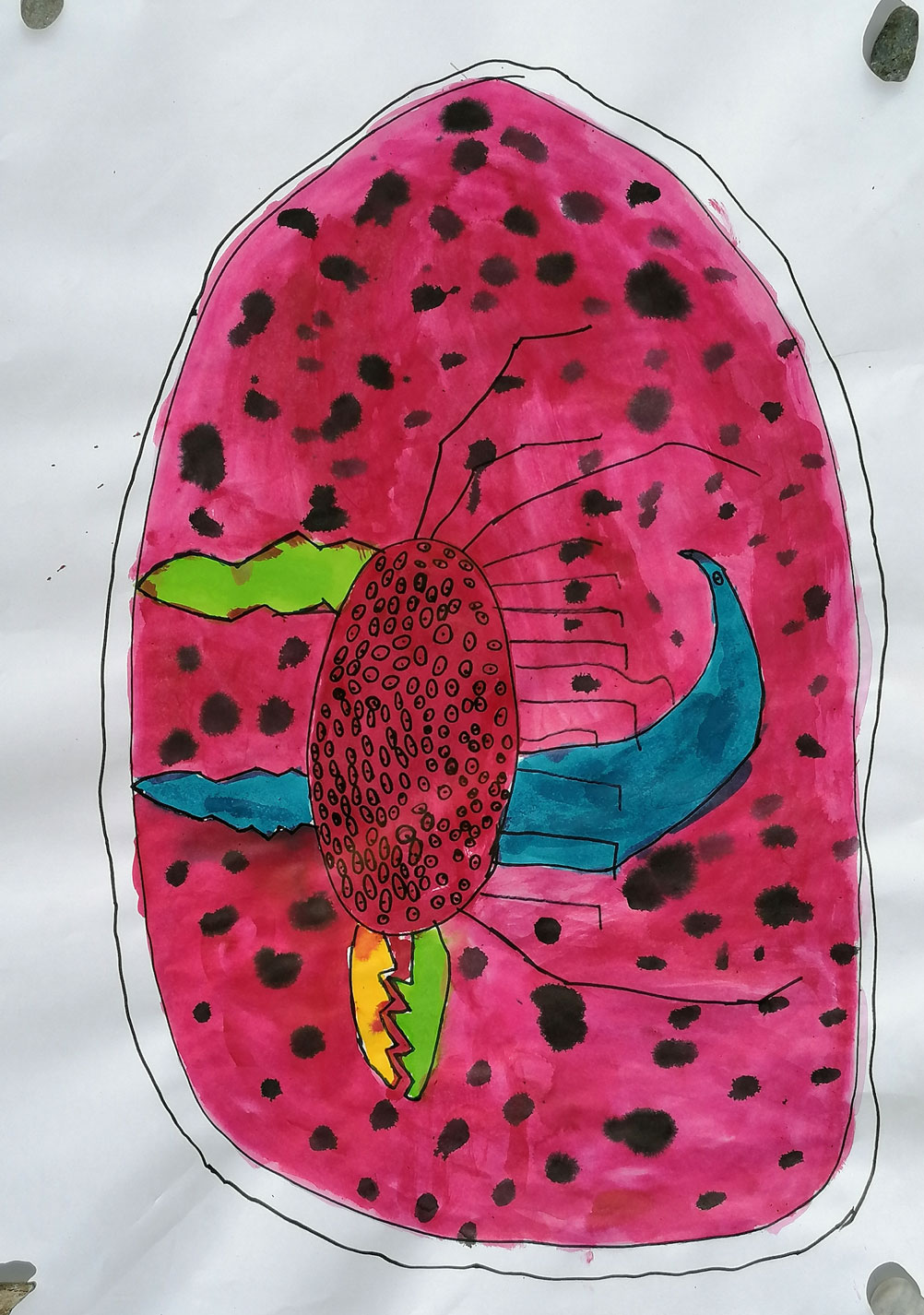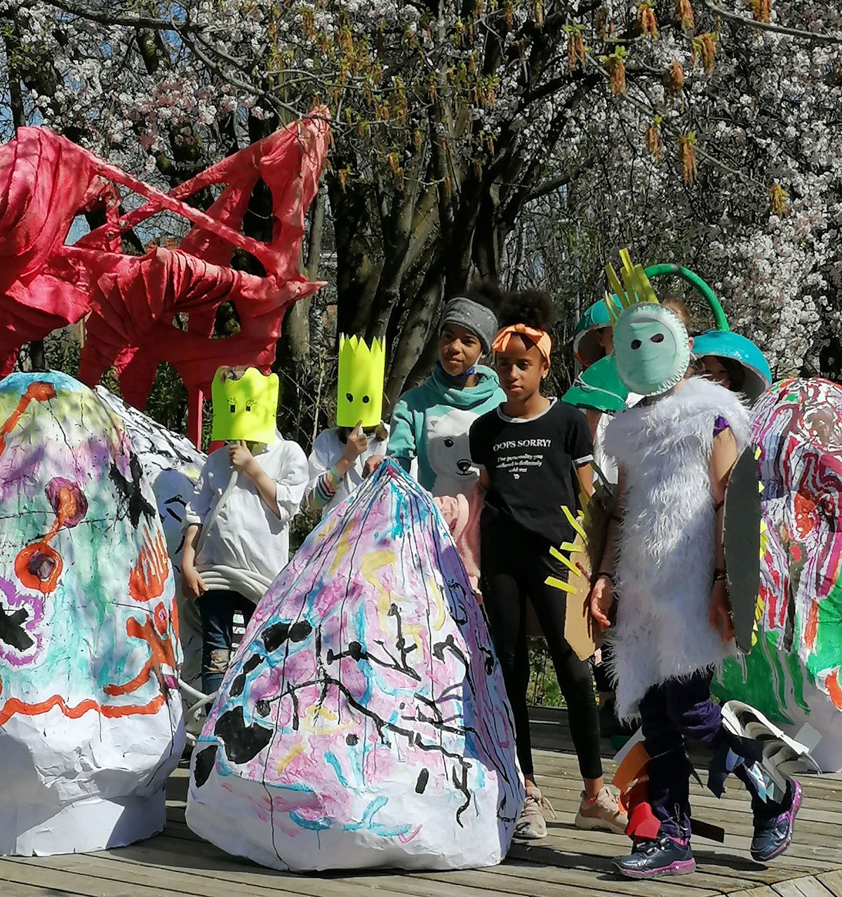 So machen wir’s jedenfalls bei diesem Workshop – zuerst legen wir große Eier, also richtig große, so dass wir darin Platz haben, dann imaginieren wir und entwickeln uns. Dazu nehmen wir was wir eben so brauchen, bissl Draht, Stoffe, Folien, Papier, Karton und lange Nabelschnüre, etc.
